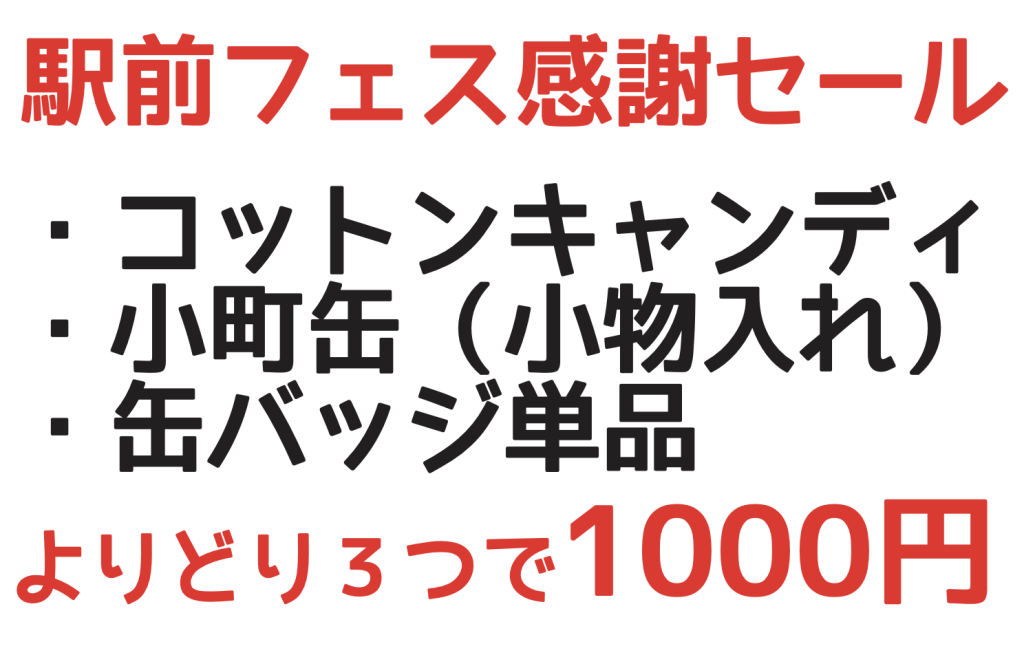 21日の駅前フェスでも展開しておりましたが、今回の缶バッジはこちらの対象商品となります。